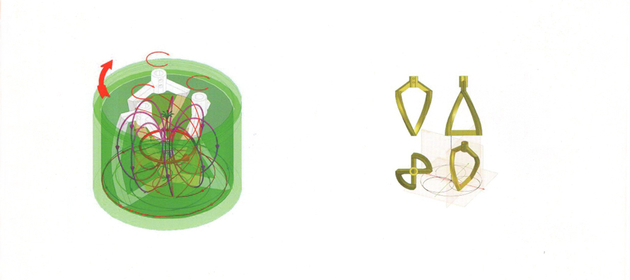 合理的流場設(shè)計是決定攪拌設(shè)備攪拌結(jié)果的要點。為了達到用戶生產(chǎn)工藝多組分、多配方的需求,以及對物料粘度的流動性的特點,將攪拌流場設(shè)計成沿公轉(zhuǎn)方向的螺旋式推進湍流流場。這種流場可以使攪拌混合與分散混合在相匹配的公轉(zhuǎn)及自轉(zhuǎn)速度下,建立起穩(wěn)定的物料三維湍流,進而達到混合要求。